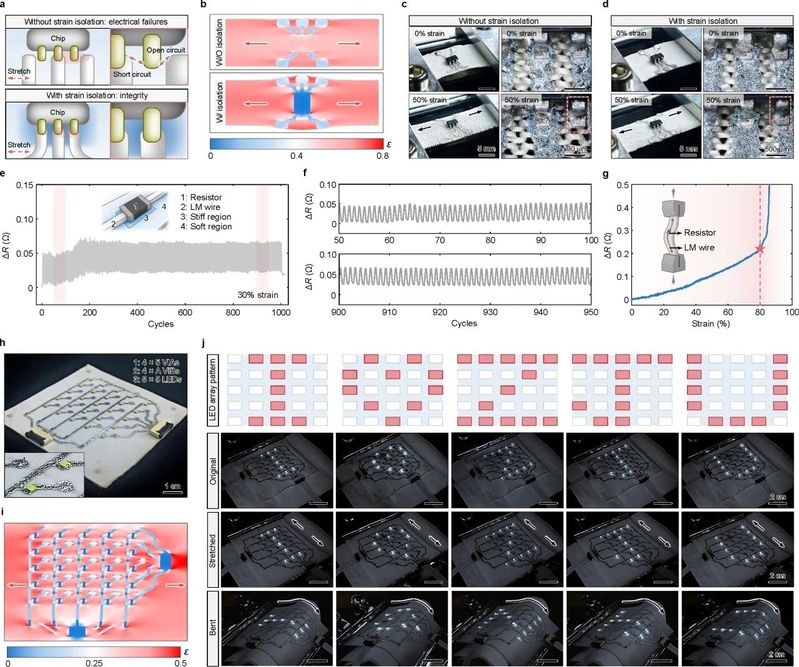 通过调控织物上高、低刚度区域的分布以形成梯度刚度,可使低刚度区域释放应变,从而保护位于高刚度区域上的芯片和导线连接界面,免受应变干扰(图4)。对于SOT-23-5结构的芯片,仿真显示,其经应变隔离后的中心区域,应变值仅为对照组的1.9%。在实验中,该芯片的引脚在50%的全局拉伸下仍保持稳定连接,且未发生跨引脚短路。综合上述激光改性织物的界面设计方法,研究团队在弹性织物上构建了5×5 LED屏幕,该屏幕能够在弯折和拉伸状态下动态显示“I LOVE ZJU”字样。