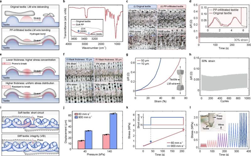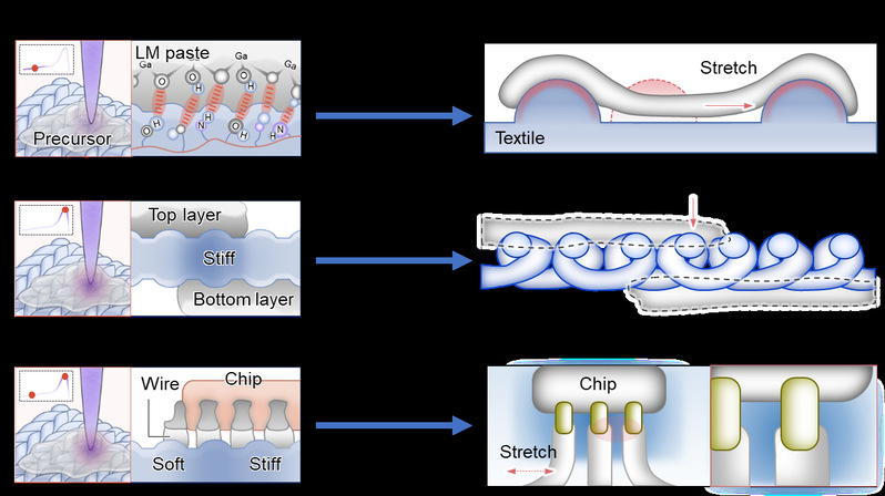 <精巧设计>:根据电子系统结构,设计改性织物的刚度分布,使织物与导线、芯片的多种连接界面可有效抵抗外部载荷(图1):(1)低刚度改性区域与液态金属(LM)导线形成可延展界面,并通过光敏聚合物提供的亲附性基团促进导线与织物的界面结合,赋予导线在弹性织物表面的拉伸稳定性;(2)高刚度改性区域与重叠的双层LM导线形成的界面可有效抑制织物的挤压变形,避免因孔隙增大引起的导线跨层短路;(3)梯度刚度改性区域可在导线、芯片的连接界面实现应变隔离,确保异质界面在织物全局拉伸时的稳定连接。