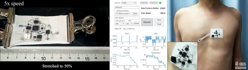 基于激光改性织物的电子集成系统具有拉伸稳定性,适合构建具有通用功能的可穿戴电子设备(图5)。研究团队设计并构建了无线、透气、界面可拉伸、可实时监测四种生理参量的织物传感系统。该系统在连续扭转及50%拉伸应变下均无功能失效。将其贴附于志愿者左胸,该系统成功检测到椭圆机运动过程中的心率爬升、体温下降及体表湿度上升。相比于具有相同电路功能的FPCB传感系统,本织物传感系统的优异延展性与透气性确保了电极的稳定贴附与充分的空气对流,从而获得了更稳定、准确的监测信号。