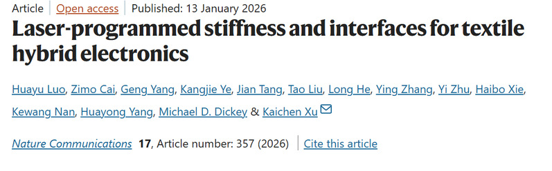 针对上述难题,浙江大学流体动力基础件与机电系统全国重点实验室,浙江大学高端装备研究院院长杨华勇院士团队徐凯臣研究员(我院双聘研究员)课题组发明了一种织物刚度的区域改性技术,通过激光诱导织物内光敏介质的聚合反应,获得了具有定制化梯度刚度和应变分布的改性织物,解决了织物电子系统界面力学失配的普适难题,实现了一体化、可拉伸的织物电子系统,相关成果以题为“Laser-Programmed Stiffness and Interfaces for Textile Hybrid Electronics”发表在国际期刊《Nature Communications》。博士后罗华昱和博士生蔡子墨为论文共同第一作者,徐凯臣研究员为论文通讯作者。该研究工作得到国家自然科学基金 (U25A20321, 52475610)、浙江省自然科学基金(LDQ24E050001, LR26E050002) 的支持。