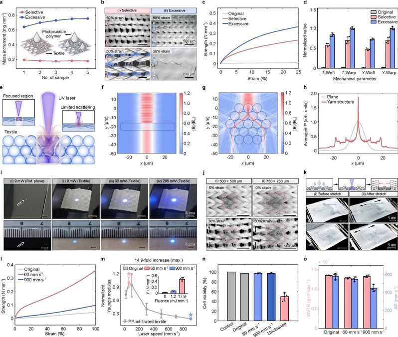 <创新工艺>:构建了织物与光敏聚合前驱体的复合体系,并通过激光诱导其选择性聚合反应,调节织物局部的聚合物交联密度和杨氏模量。由于该聚合物与纺织结构紧密嵌合,聚合物模量耦合至织物刚度,从而赋予改性织物定制化的刚度分布,为电子系统的界面力学调控奠定基础。