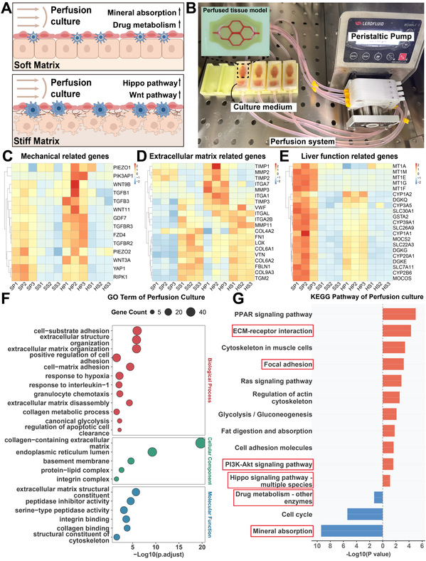 在体外通过调节基质刚度,使三维环境下的肝星状细胞成功响应物理微环境变换并激活,实现α -SMA、胶原相关基因的高表达。同时肝细胞出现代谢功能障碍,与体内病理特征相似,以此模拟了纤维化过程。通过肝星状细胞在硬基质上的持续培养,观察到一系列与进行性肝纤维化高度相关的关键生物学事件:基质刚度力学信号刺激、整合素上调以及胶原蛋白分泌所共同作用而形成的进行性纤维化。为了更好的还原体内的动态环境,研究团队搭建了灌注平台,动态模型会放大肝细胞在高刚度环境下的功能损伤,同时硬基质上调相关纤维化发生信号通路但抑制肝组织功能,使病理表现更贴近体内,证实血流动力学刺激的必要性。
