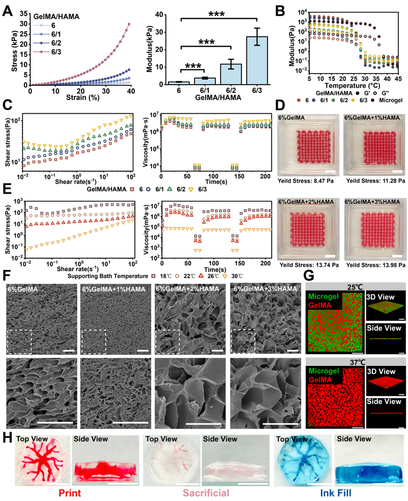 通过调节GelMA与HAMA比例,制备模量1.57 kPa至27.5 kPa的水凝胶,添加明胶微球优化支撑浴流变性能,并具备快速自修复能力。在上述支撑浴中打印明胶牺牲生物墨水,交联后37℃溶解牺牲材料,形成直径300-600 μm的互通血管网络,蓝色染料灌注验证可灌注性。