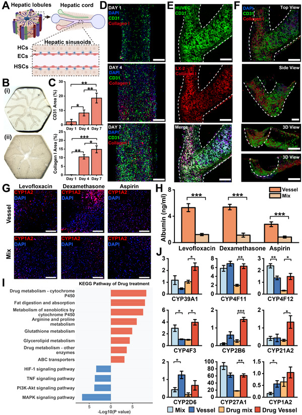天然的肝组织以肝小叶作为基本单元构成,而其中存在的特殊微血管结构被称为肝血窦,肝血窦主要由内皮细胞与肝星状细胞组成。这些细胞均匀的分布在血管内壁,在肝脏的代谢与免疫反应等过程中扮演着重要角色。研究团队精准构建了具有层级血管的肝小叶组织,并进行了药物毒性测试,证实了具有血管化的肝组织对于药物毒性响应更稳定,具有更高的生理准确性。
