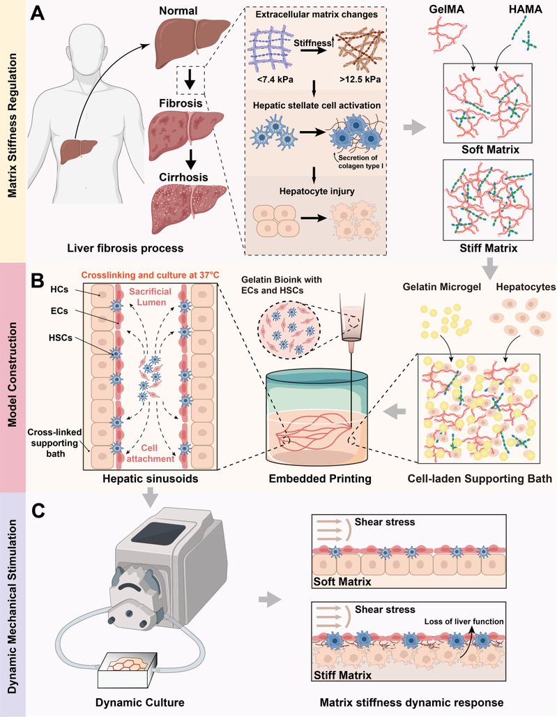 肝脏是人体内最大的实质性器官,承担多种至关重要的生理功能。肝脏疾病严重威胁人民生命健康,肝纤维化是慢性肝病的共同病理终点。肝纤维化的核心是以肝组织中细胞外基质过度沉积和肝星状细胞的持续激活为特征,形成一个自我加剧的恶性循环,导致肝组织变硬和肝功能受损。开发一种能够同时模拟肝纤维化过程中基质刚度变化、三维细胞相互作用以及动态血流剪切力的体外模型,对于深入理解肝纤维化的发病机制以及开发有效的抗纤维化治疗策略具有重要意义。尽管已有研究通过二维模型或静态三维培养模拟纤维化微环境,但目前体外肝组织缺乏肝血窦结构和三维基质环境下的动态力学刺激,导致肝细胞对力学信号响应不足,无法真实再现人体肝纤维化的力学与生物学机制。